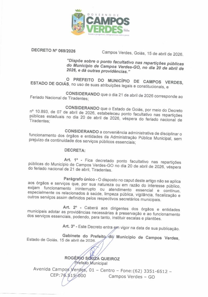 Decreto n° 051/2026 Dispõe sobre o ponto facultativo nas repartições públicas do Município de Campos Verdes-Go